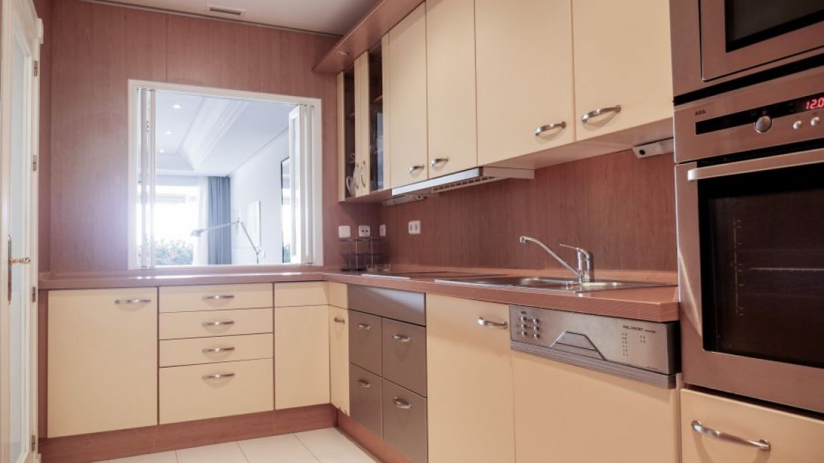 El apartamento en si consta de 130 m2 con orientación Este y visión a mar y jardín. Hall de entrada con armario y calentador eléctrico de agua con capacidad para 200 l, cocina completa, salón comedor y terraza, suite principal con baño y dormitorio secundario con su correspondiente baño. Dispone de Aire Acondicionado y Calefacción. Baño principal con bañera de hidromasaje y ducha. Caja fuerte.