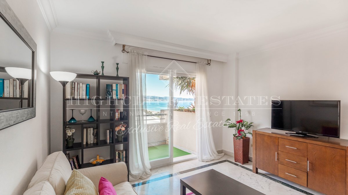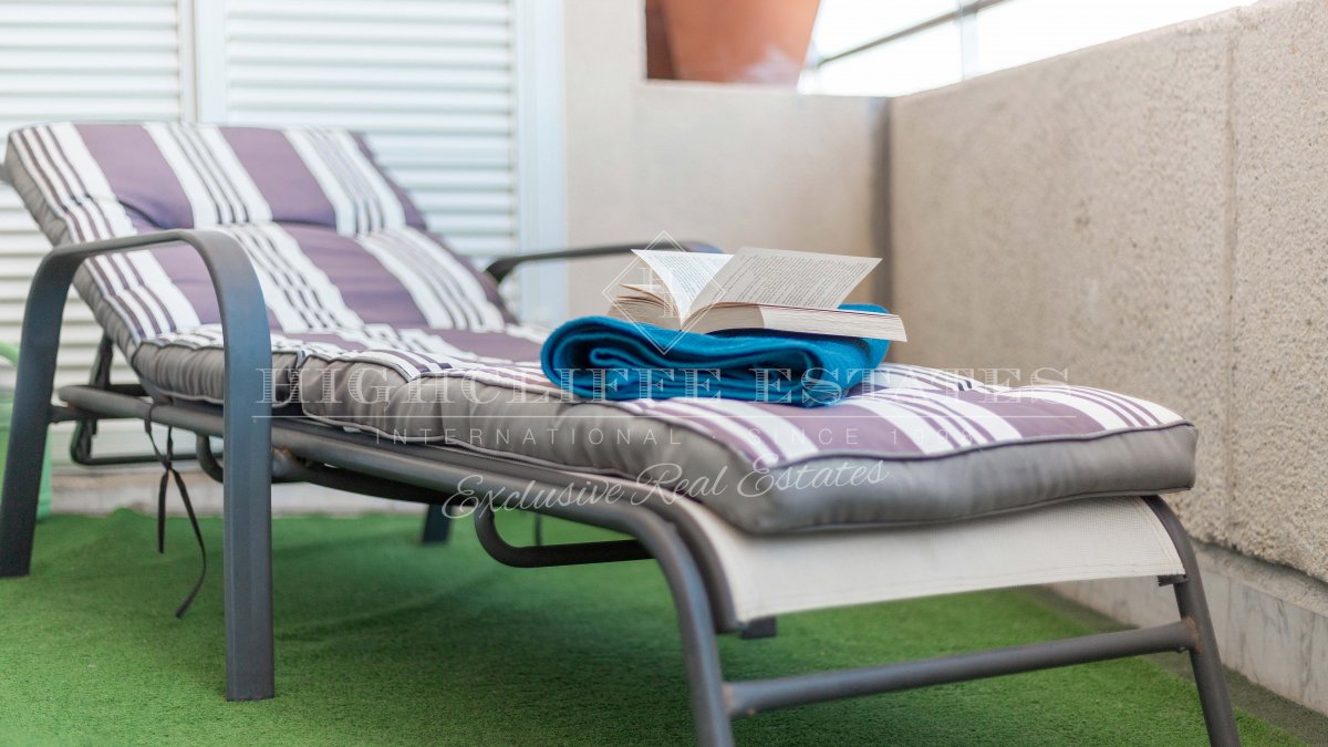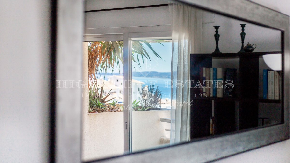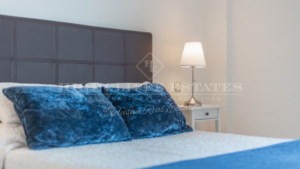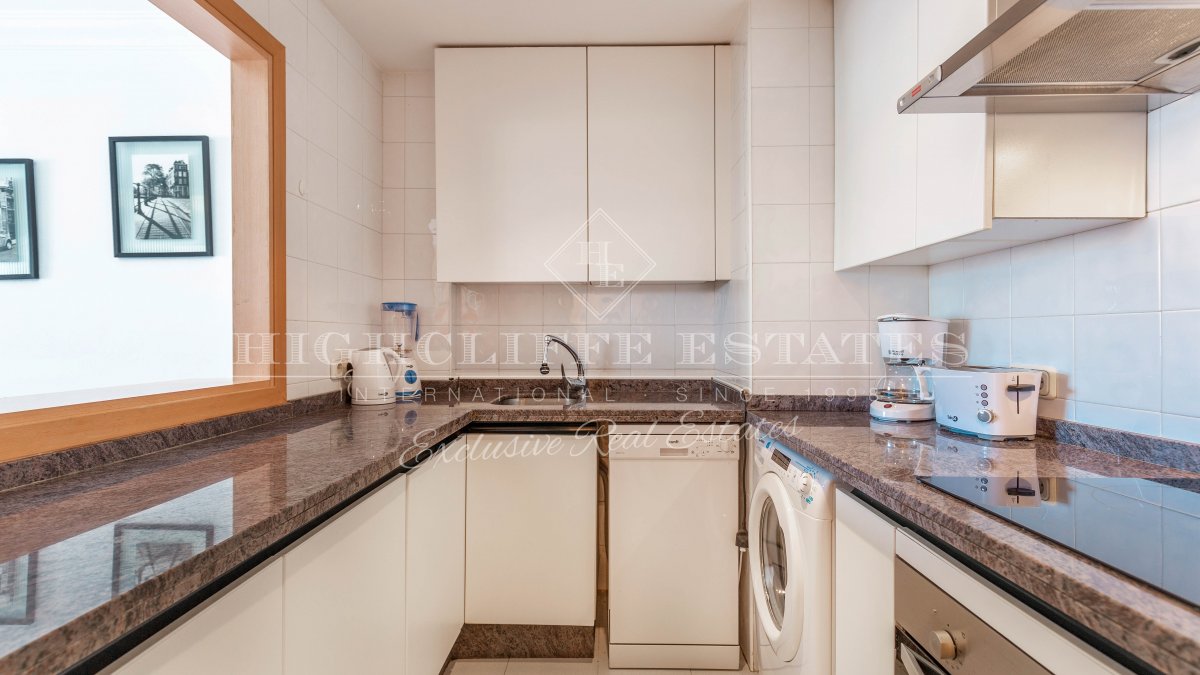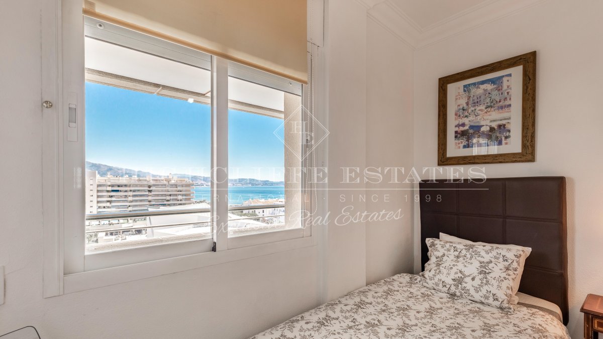 Tiene 2 dormitorios, 2 baños, cocina completamente amueblada (lavadora, horno, etc), A/C frío-calor y una terraza (20m2) con vistas hacia el Puerto y vistas parciales del mar.
