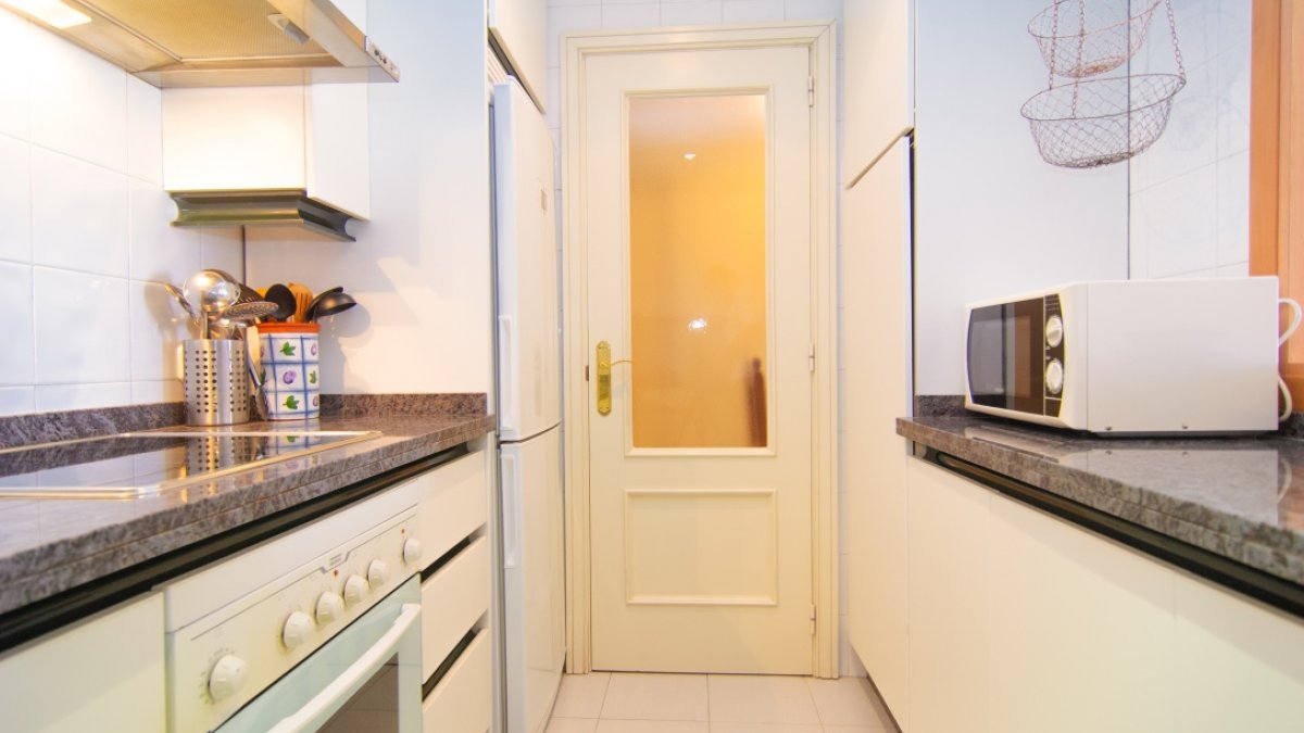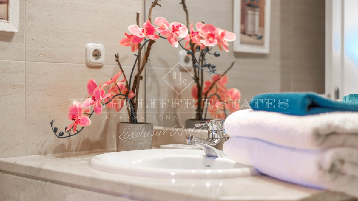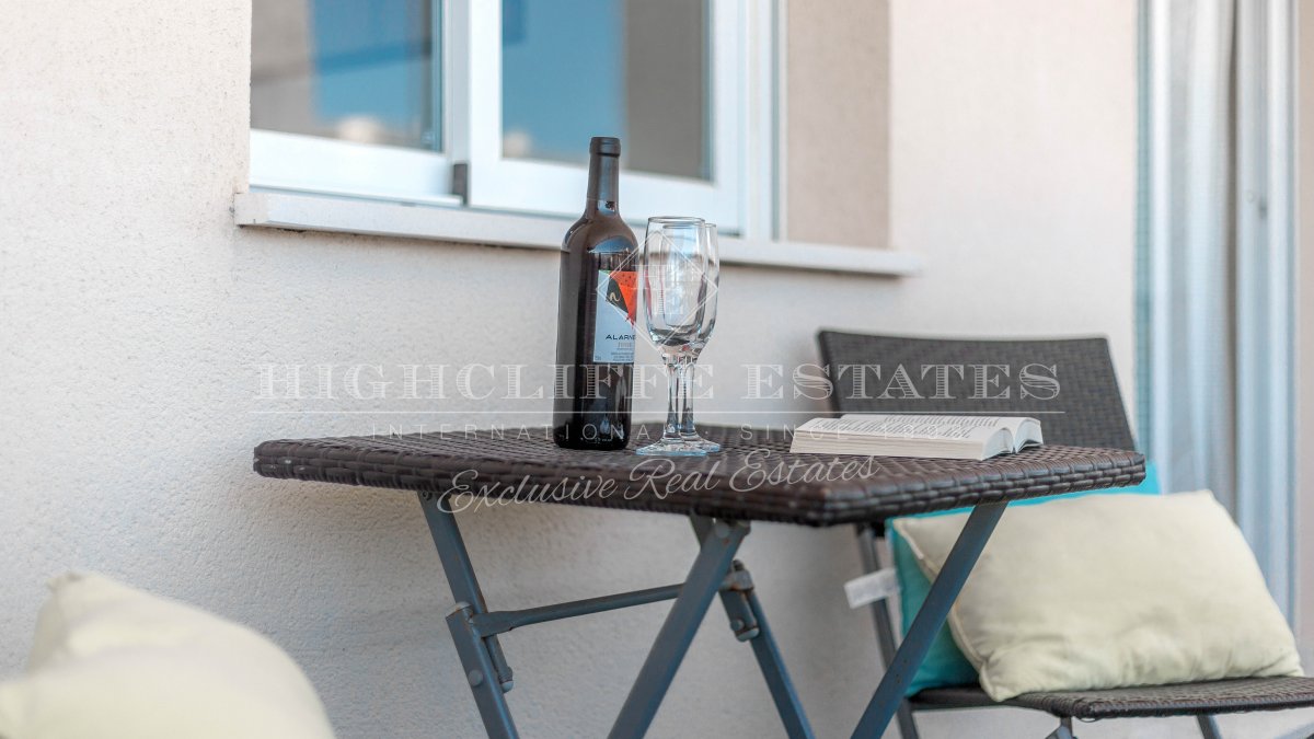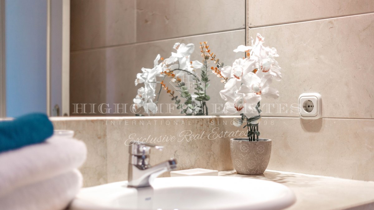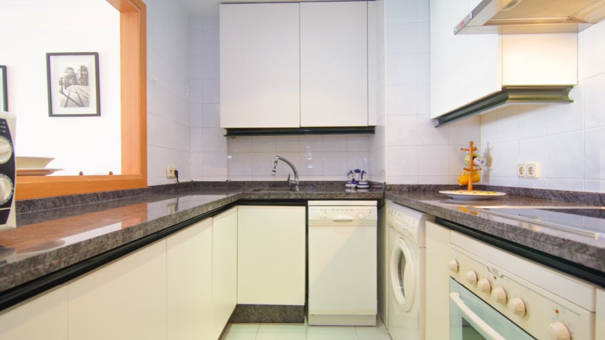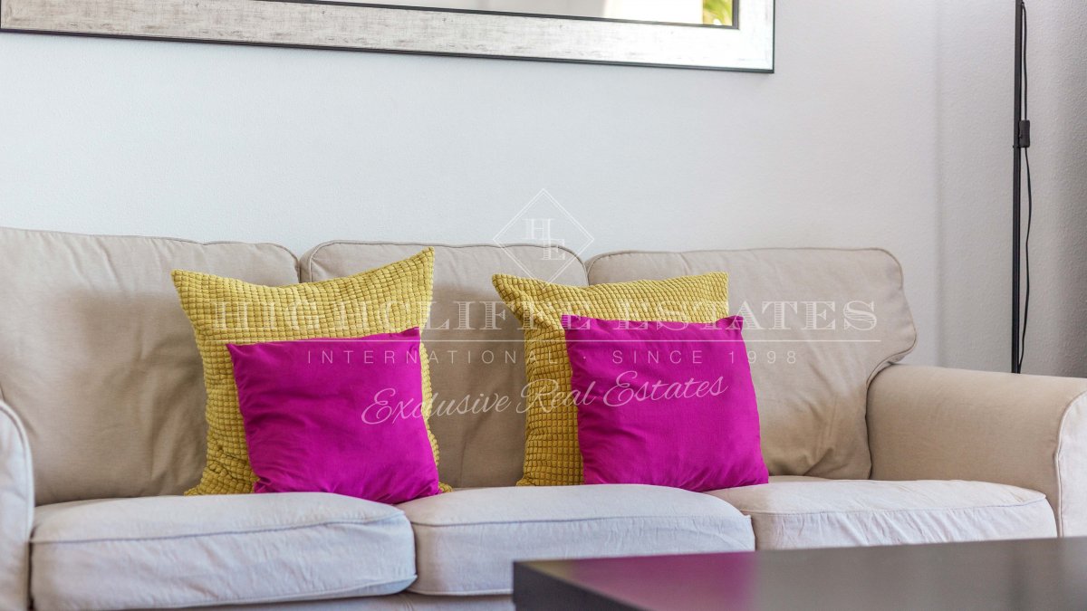 Tiene 2 dormitorios, 2 baños, cocina completamente amueblada (lavadora, horno, etc), A/C frío-calor y una terraza (20m2) con vistas hacia el Puerto y vistas parciales del mar.