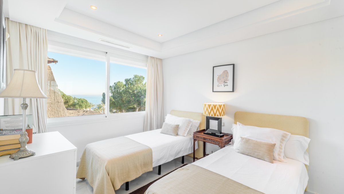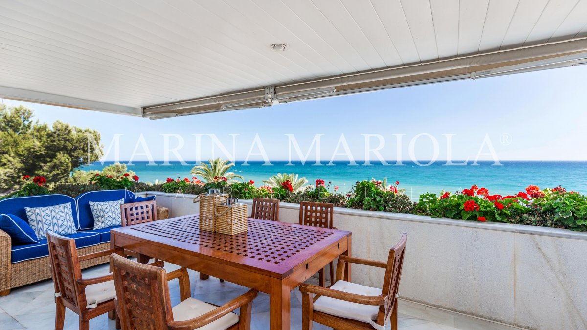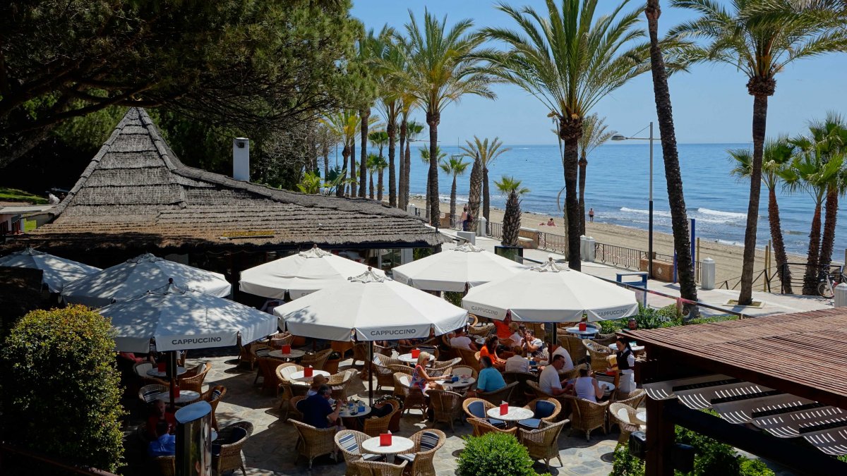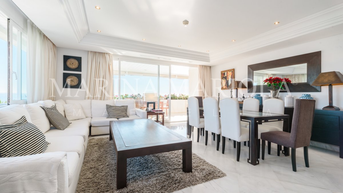 La terraza en esquina tiene orientación Sur Este y disfruta de vistas directas al mar y de toda la costa hasta Puerto Banus, Estrecho de Gibraltar y Marruecos.
