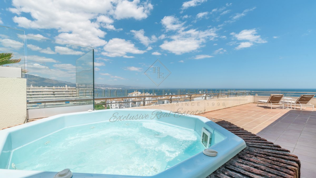 Vistas de 180º de la costa, gran terraza con BBQ y Jacuzzi. El complejo cuenta con seguridad, piscinas privadas, pista de tenis y gimnasio.