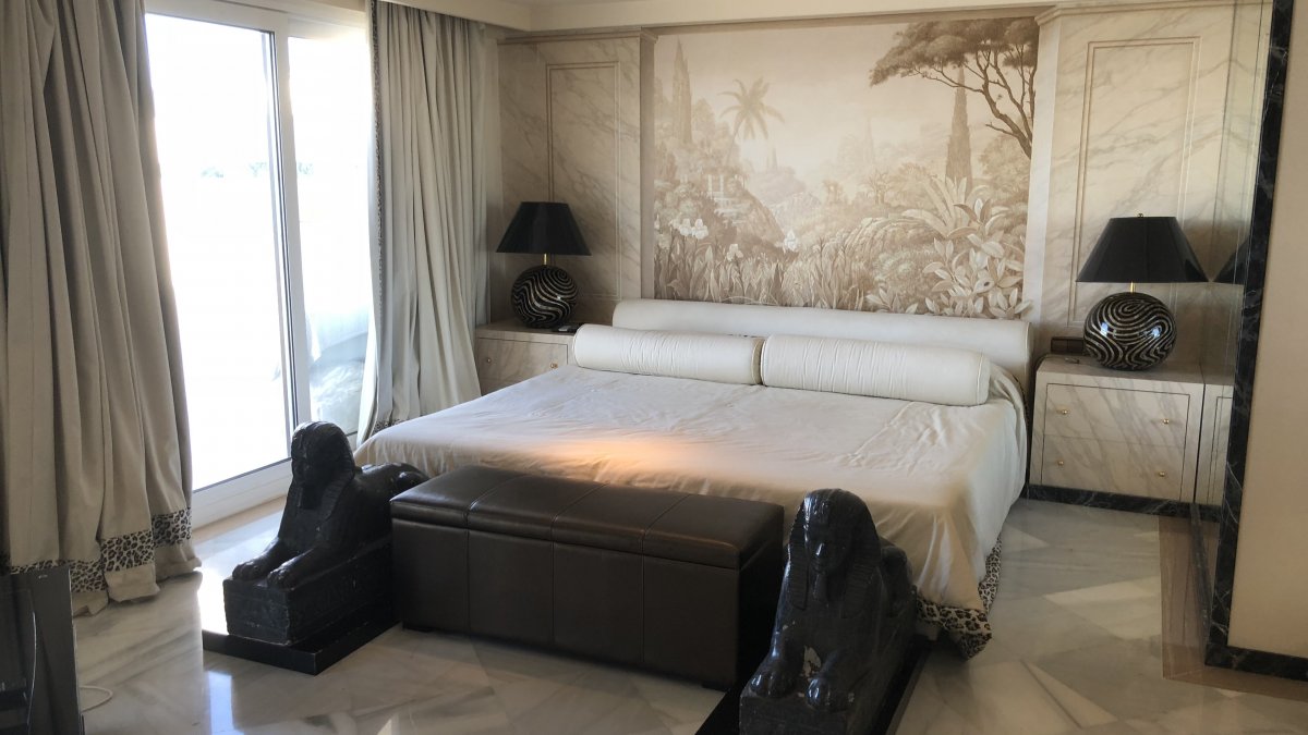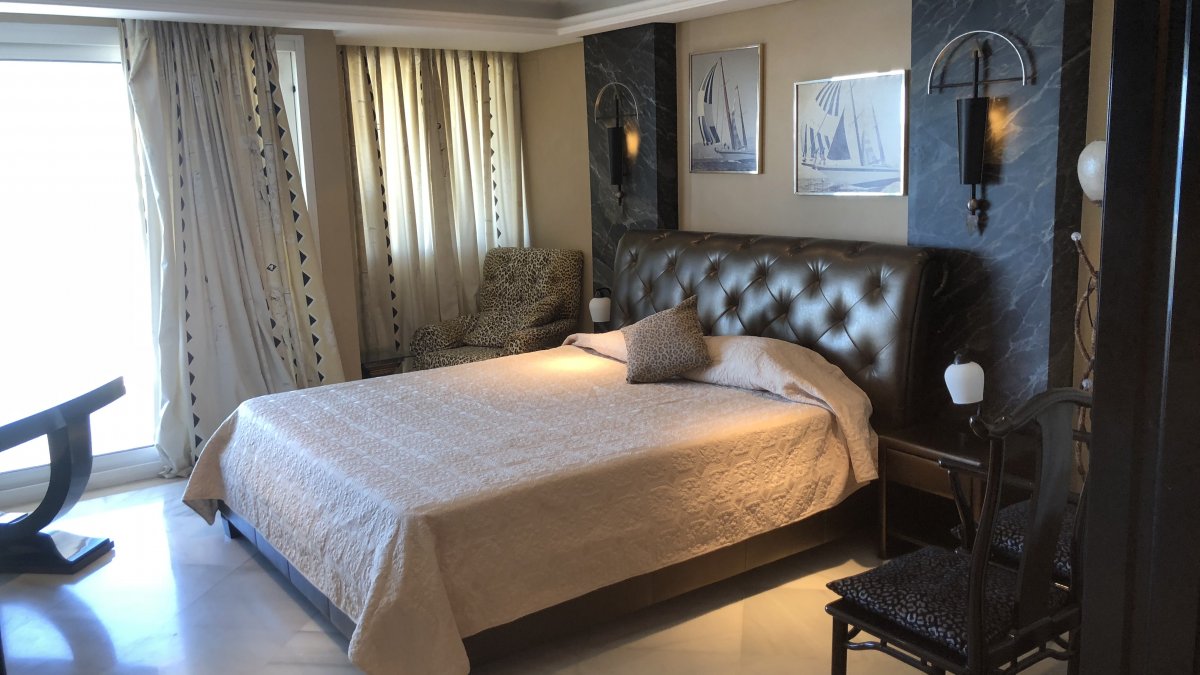 Amplio apartamento en primera línea de playa, en urbanización con seguridad las 24 horas en el corazón de Marbella, una de las zonas más cotizadas de la Costa. Esta propiedad con orientación sur, que originalmente eran 2 propiedades separadas, cuenta con una de las mejores vistas panorámicas al mar e incluye: vestíbulo; salón/comedor con chimenea, bar y acceso a una terraza en esquina con orientación sur y suroeste y vistas panorámicas al mar; cocina totalmente equipada con acceso a la zona de comedor y a la terraza; dormitorio principal en suite con zona de vestidor, baño para él y para ella y acceso a terraza; 2 dormitorios adicionales, uno de ellos en suite y el otro actualmente usado como despacho, ambos con zonas de vestidor y acceso a la terraza; amplio trastero que puede convertirse en un baño adicional; aseo de invitados; lavadero. La propiedad incluye 2 plazas de aparcamiento dobles en garaje subterráneo para un total de 4 coches.