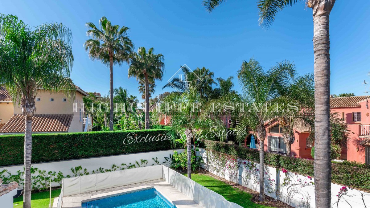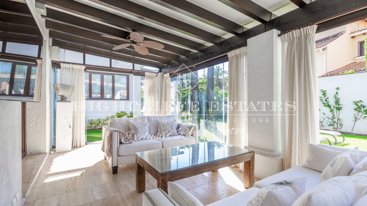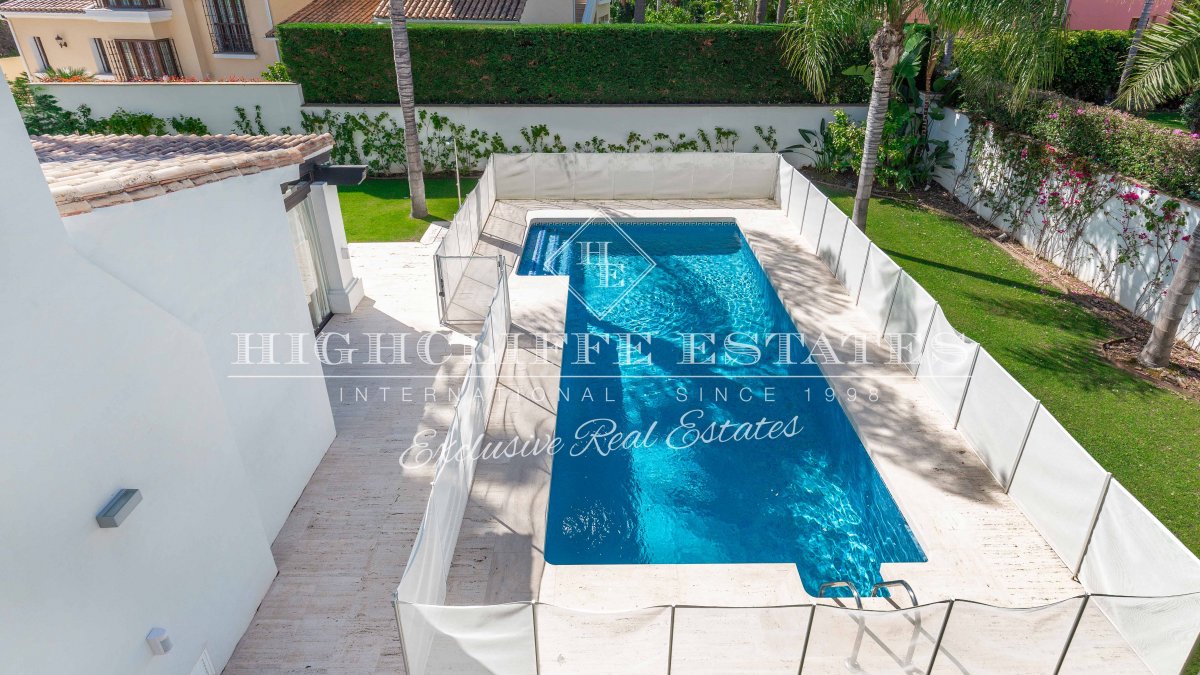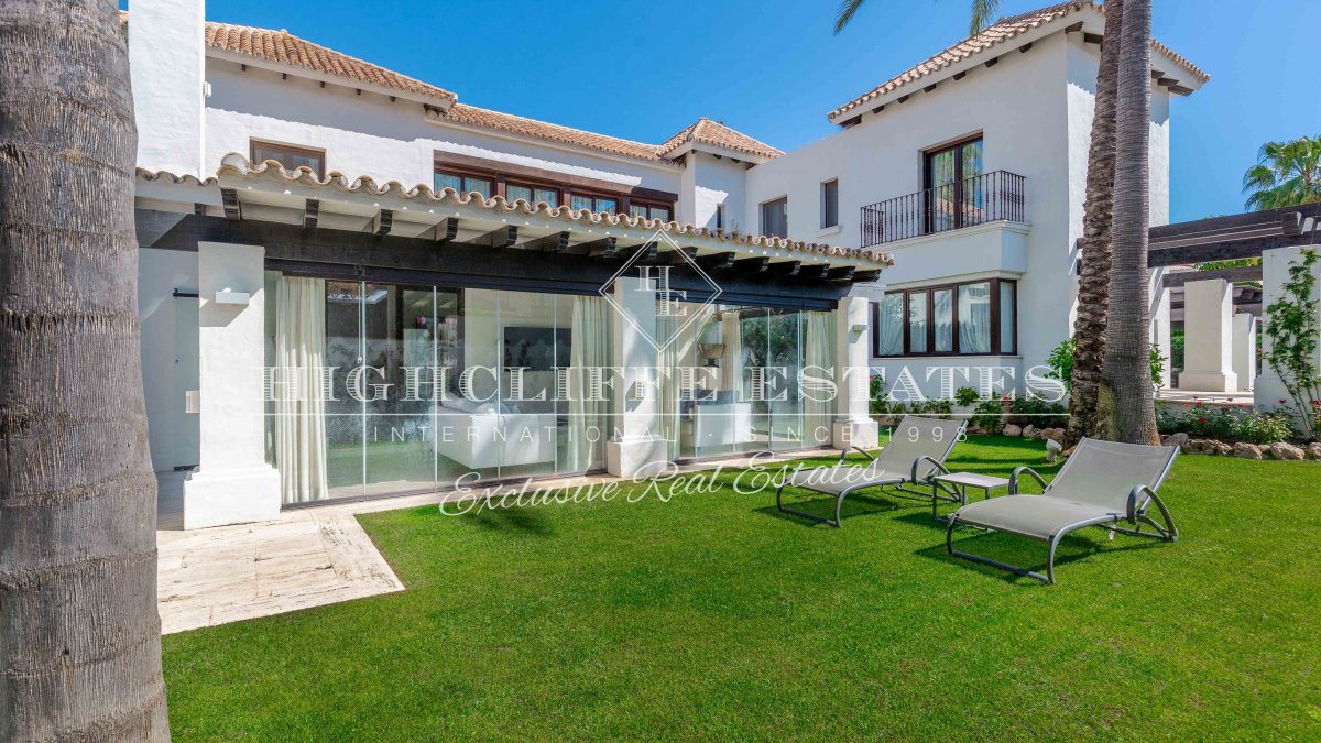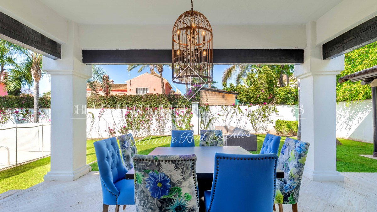 vistas al jardin, vistas a la piscina, servicios cercanos, lado playa, cerca de golf, cerca de playa/mar, parque para niños cercano, cerca del puerto, colegios cerca, tiendas cerca, cerca de la ciudad, transporte cercano, aire acondicionado, excelente estado, riego automático, barbacoa, rejas, sotano, terraza cubierta, armarios empotrados, puertas de cristal, aseo para visita, suelos de marmol, cocina totalmente equipada y sala de cine.