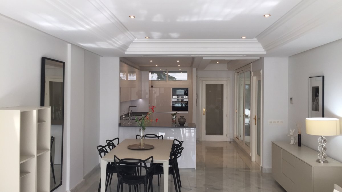 El apartamento en si consta de 130 m2 en Tercera Planta con orientación Este y visión a mar y jardín. Apartamento recién reformado y excelentemente decorado, nueva cocina completa abierta a salón comedor y terraza, suite principal con baño y dormitorio secundario con su correspondiente baño. Dispone de Aire Acondicionado y Calefacción. Baño principal con bañera de hidromasaje y ducha. Caja fuerte. 2 plazas de parking cubierto y trastero con puerta de seguridad y alarma.
