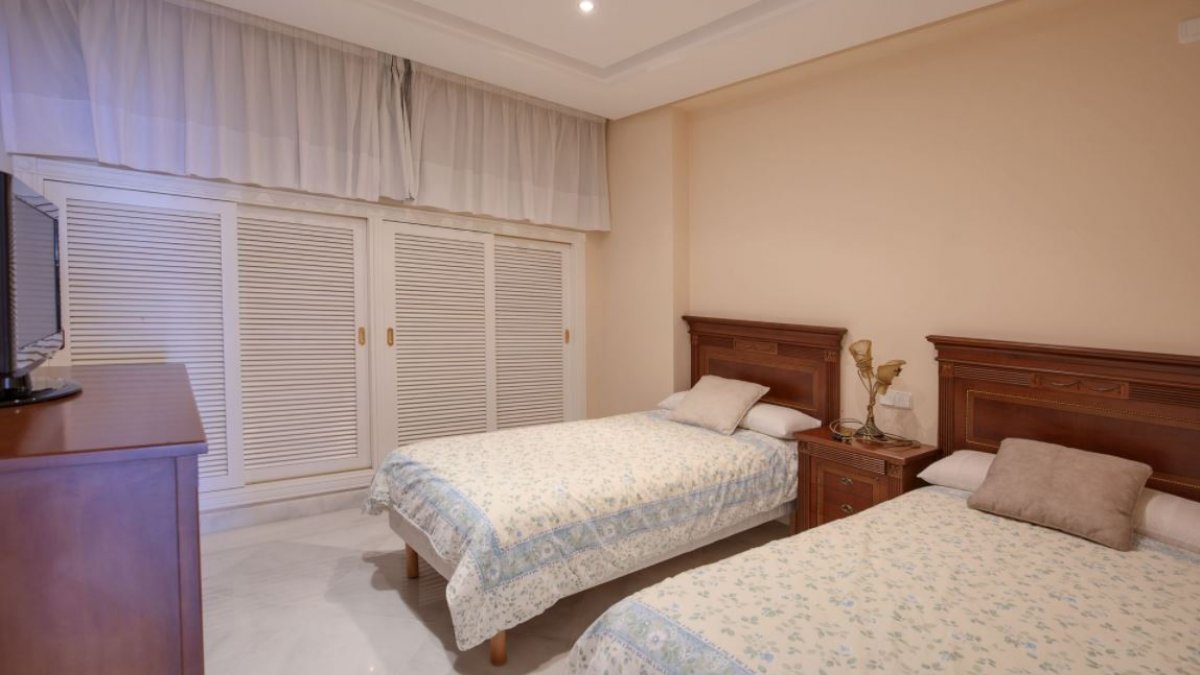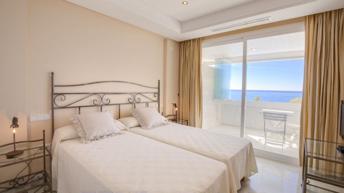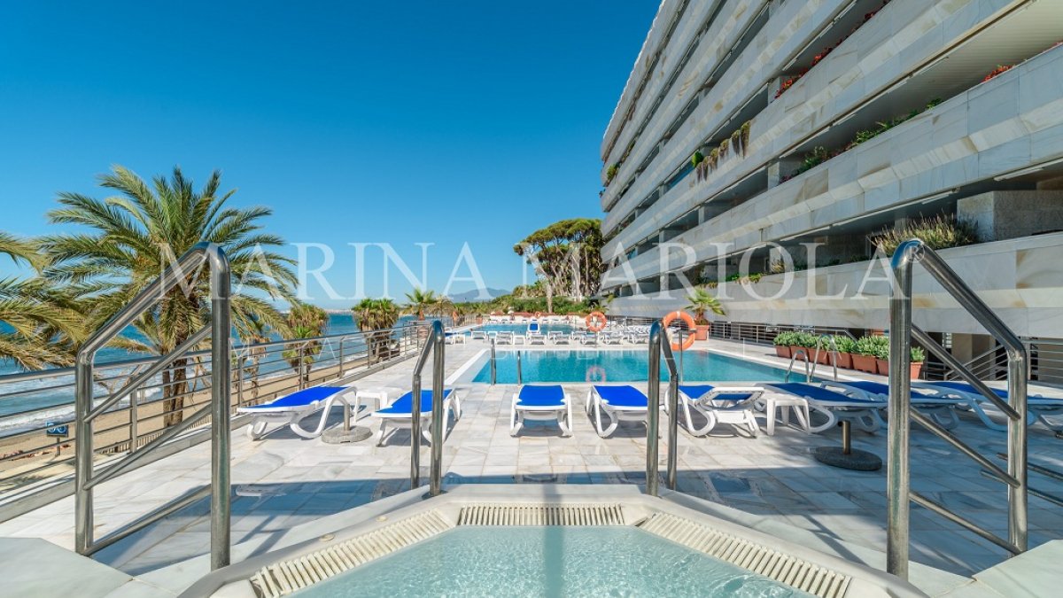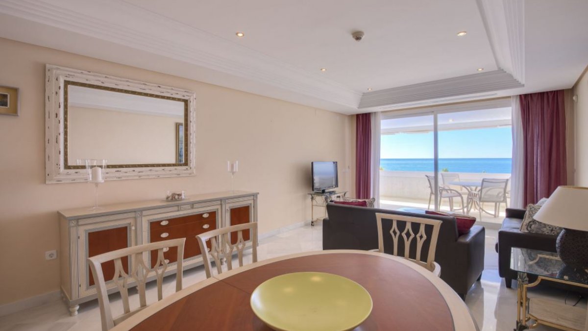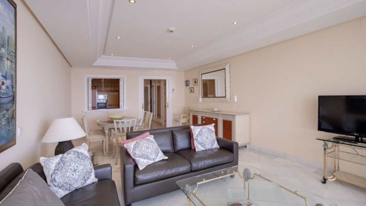 Elegante apartamento en el complejo de lujo Marina Mariola Marbella. En pleno paseo marítimo de Marbella con orientación Sur y 180 grados de visión de Marbella, Puerto Banus y el Estrecho de Gibraltar.