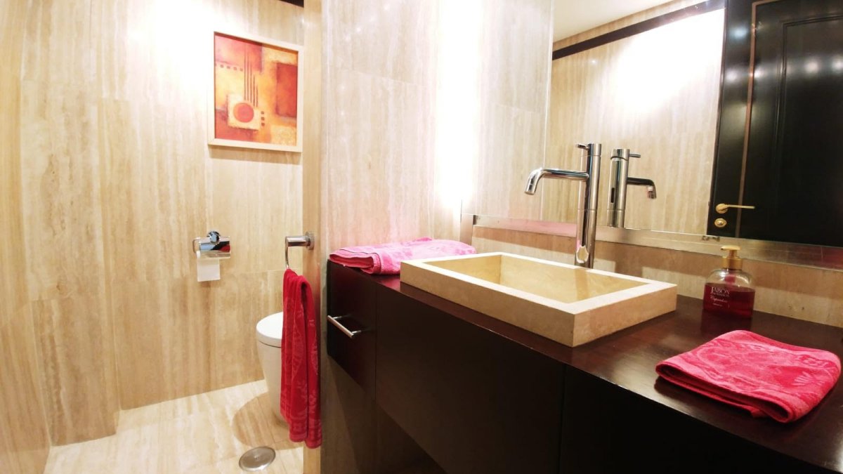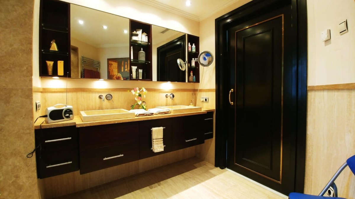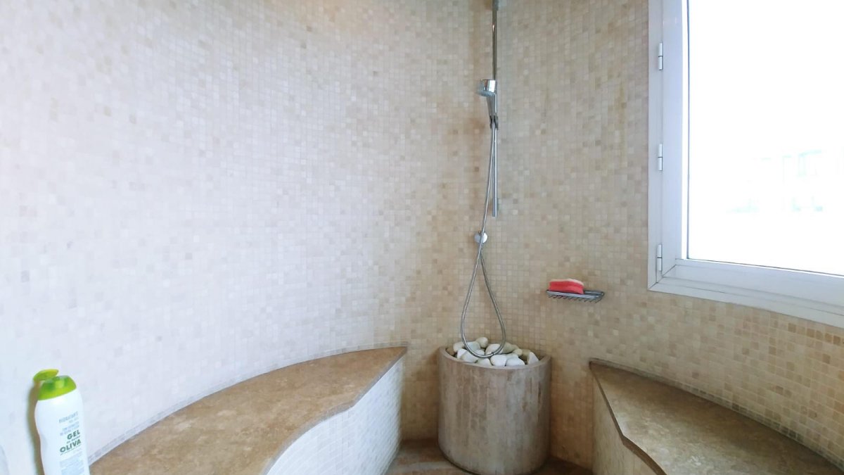 It consists of 3 bedrooms, 2 full bathrooms - one of them with Hamman - and a toilet, with a total area of 180 m2.