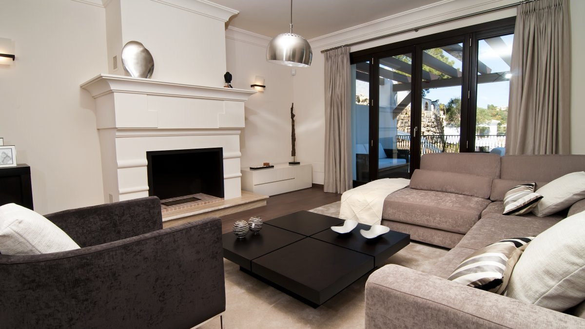 The main house is built over 3 floors. On the ground floor is the main entrance, a large high-ceilinged living room with fireplace, separate dining room, porch and open terrace. The kitchen is Italian designed by Doimo, with Gaggenau and Miele appliances and has a large open terrace. There is a bedroom with an en-suite bathroom and a guest toilet.