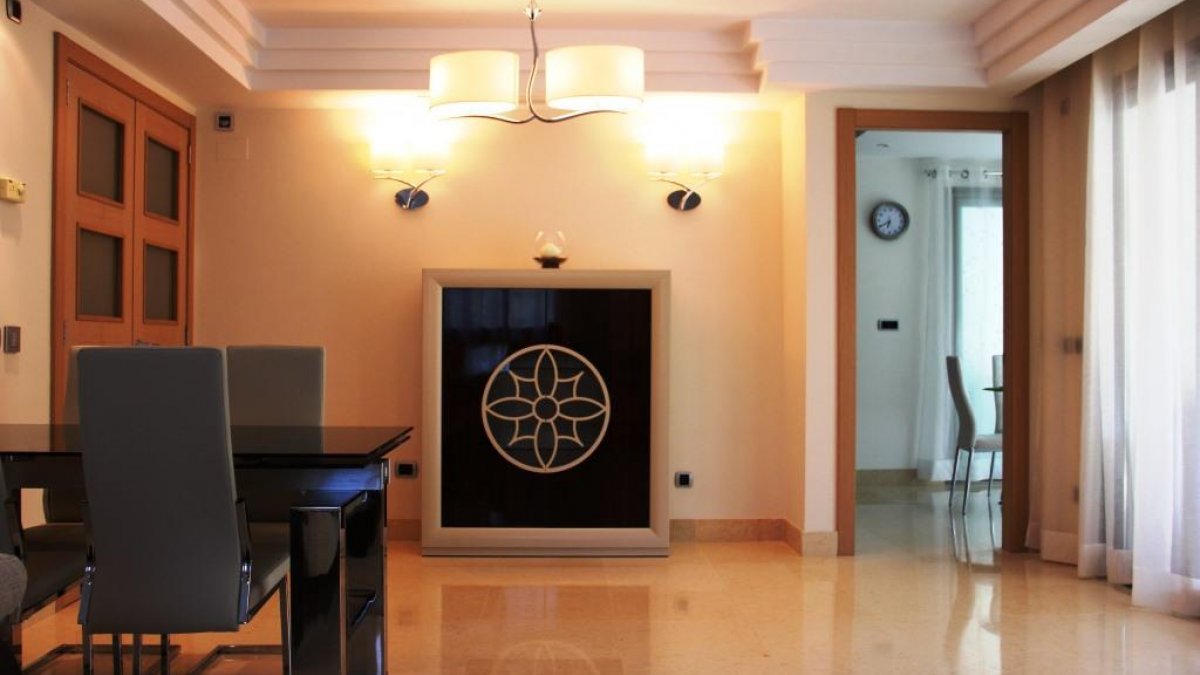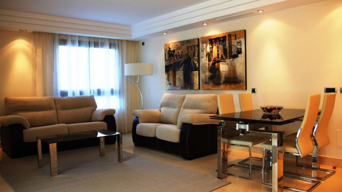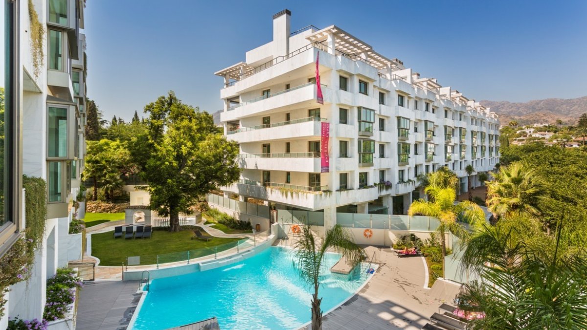 Elegante apartamento de estilo moderno totalmente nuevo situado en un prestigioso complejo de lujo en plena Milla de Oro de Marbella, cerca del conocido Pirulí de Marbella, Palacio de Congresos, Corte Ingles, Starbucks y a corta distancia de la Marbella Centro Universitario Internacional o Marbella International University Centre MIUC.